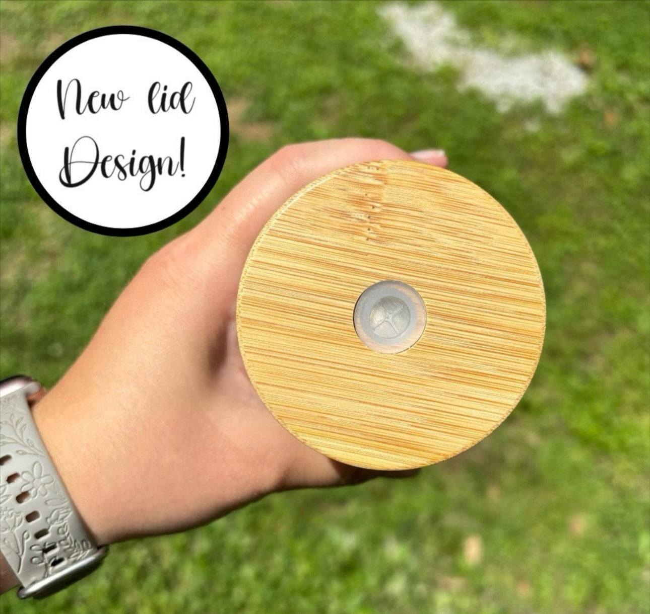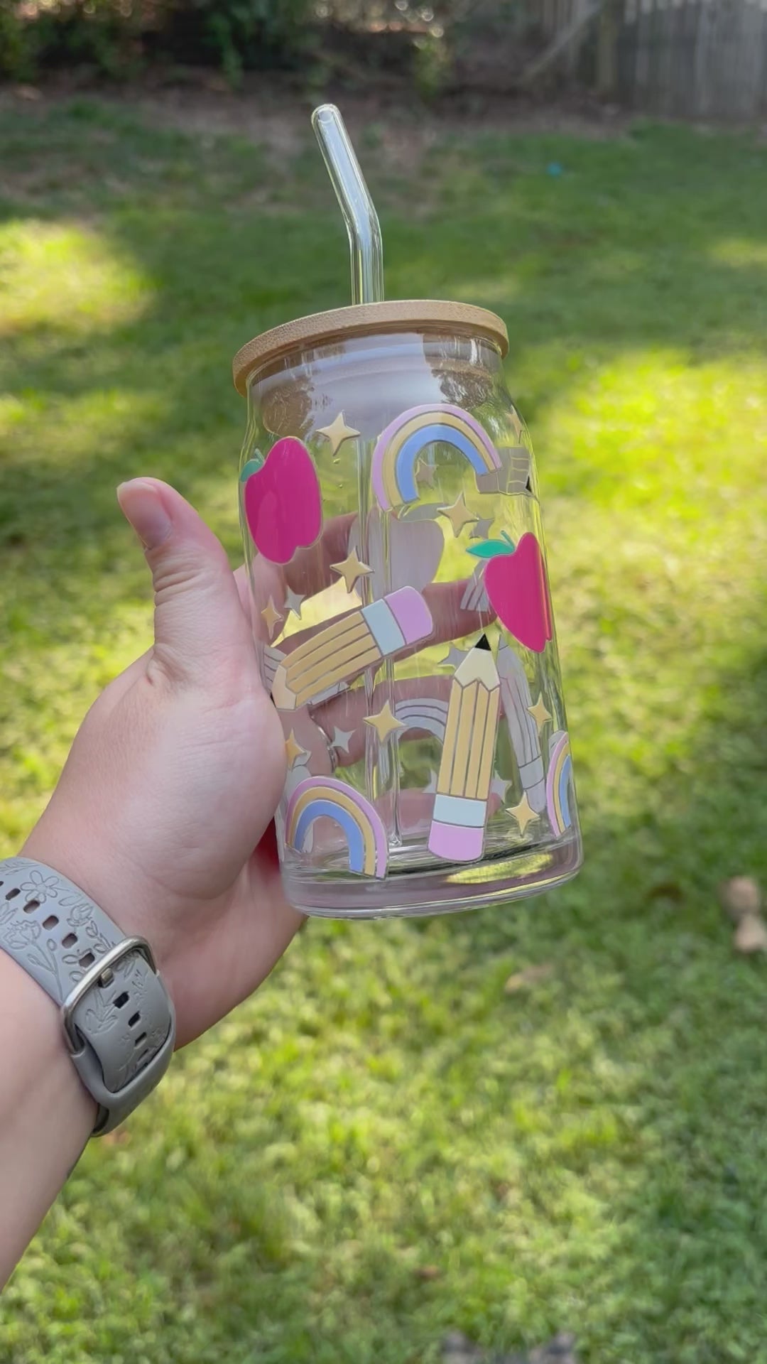 It's got a pretty teacher inspired design that won't fade or peel, thanks to a special coating. And to keep your drinks just right, we've included a lid made of bamboo. Plus, there's a glass straw for sipping without plastic waste.