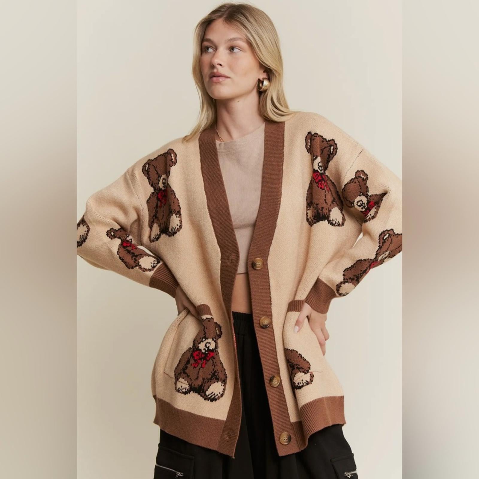 This teddy bear cardigan is the definition of cozy-cute 🤍 Featuring an oversized fit, neutral beige tones, and adorable teddy bear detailing, this button-up sweater is perfect for fall and winter layering. Style it with jeans, trousers, or leggings for an effortlessly cozy look. A must-have cardigan for casual outfits, holiday season wear, or a fun statement layer. Makes a great gift for teddy bear lovers and cozy fashion fans.