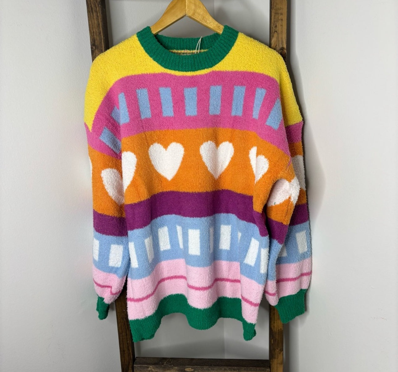 This colorful heart knit sweater features playful stripes, soft textured knit, and an eye-catching heart design that’s perfect for Valentine’s Day and everyday wear.