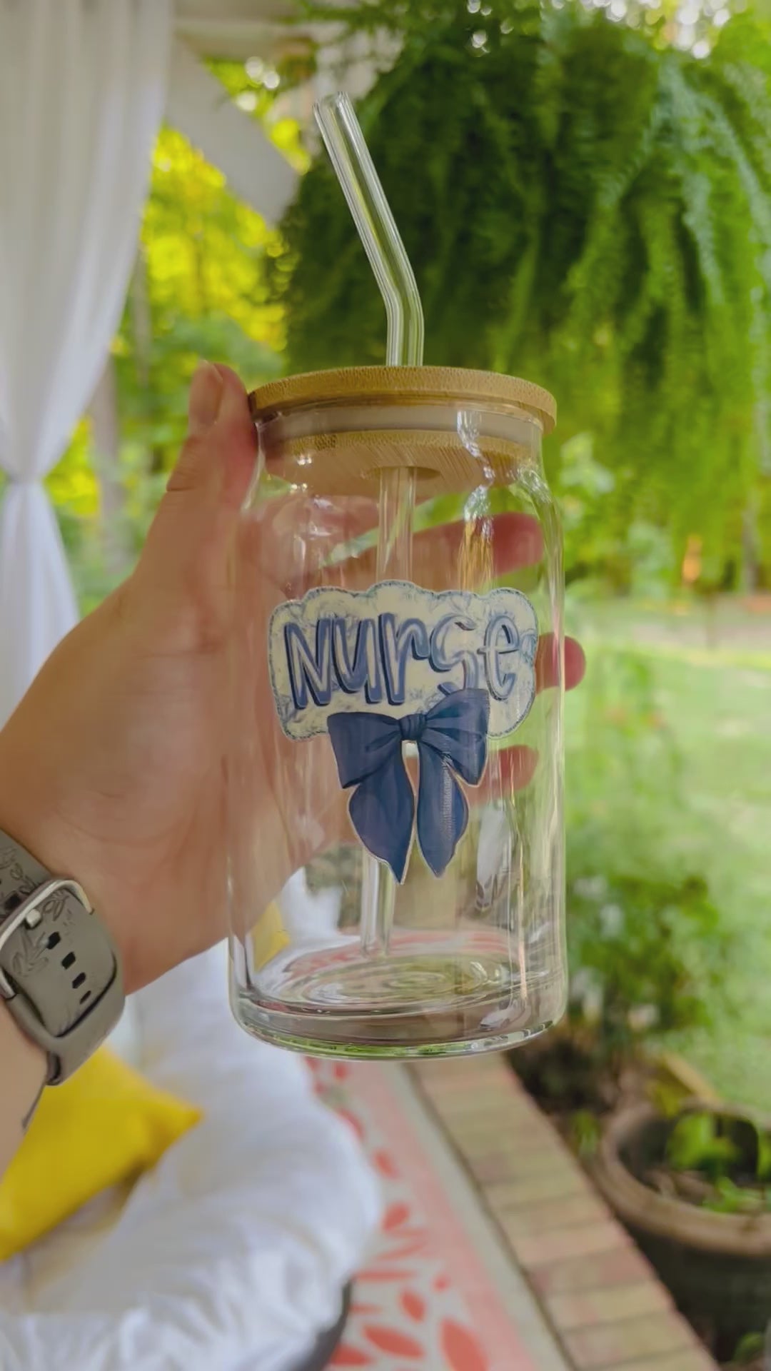Nurse Coquette Blue Bow 16oz Glass Cup