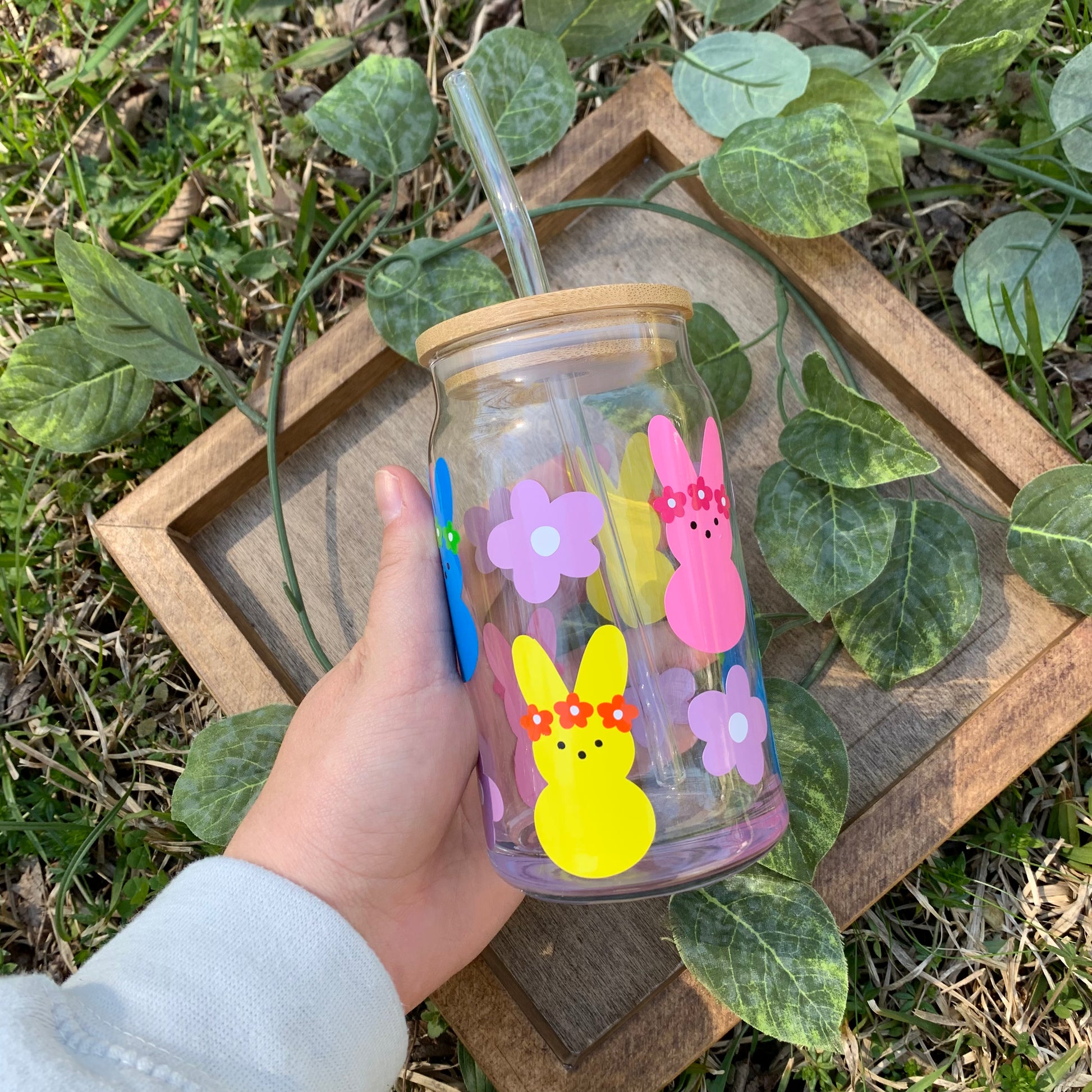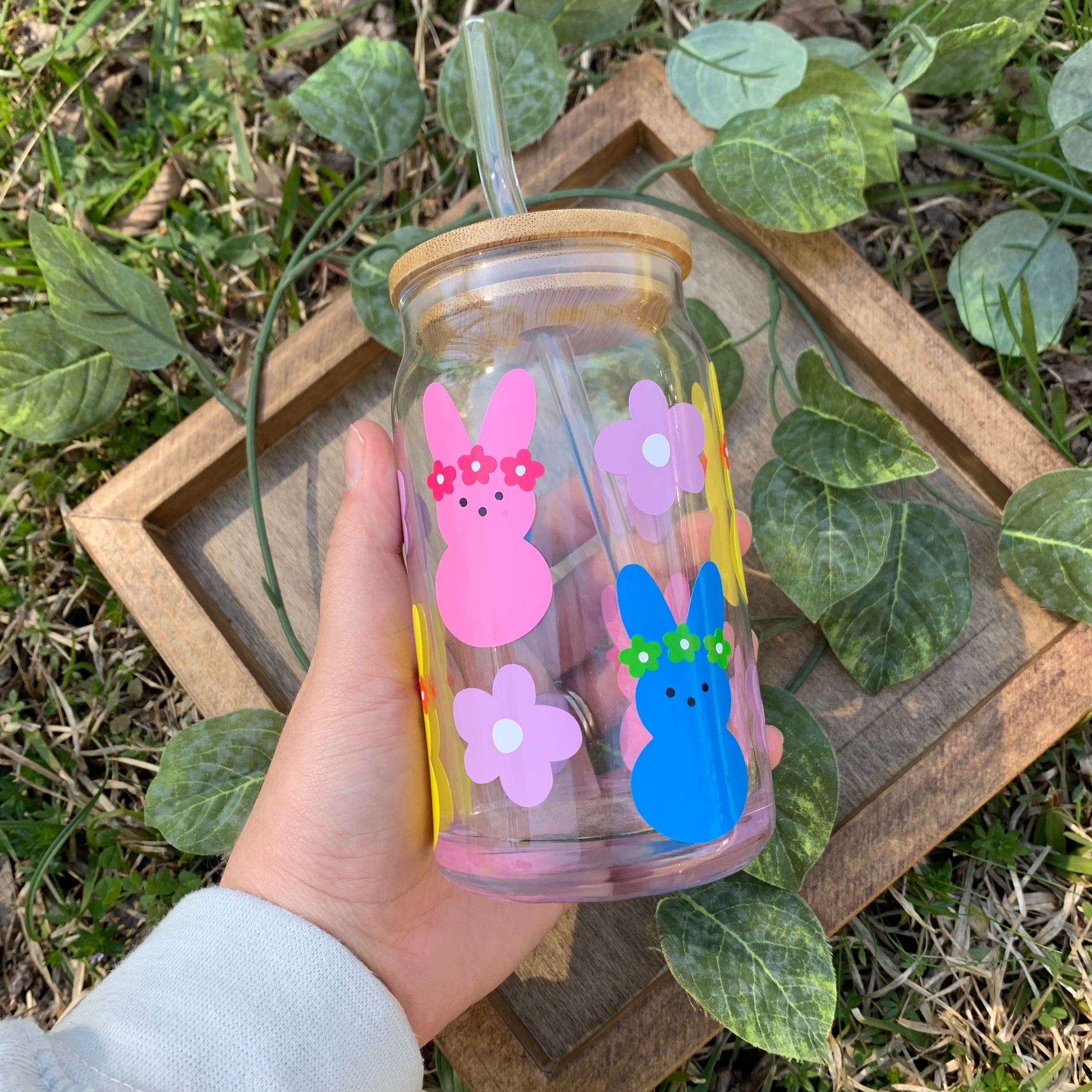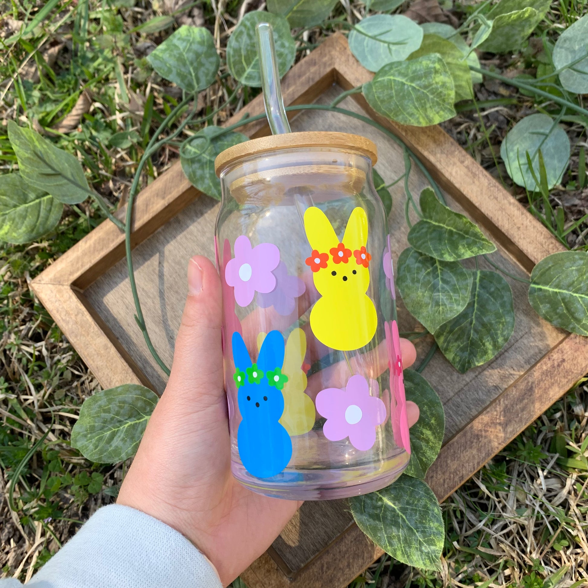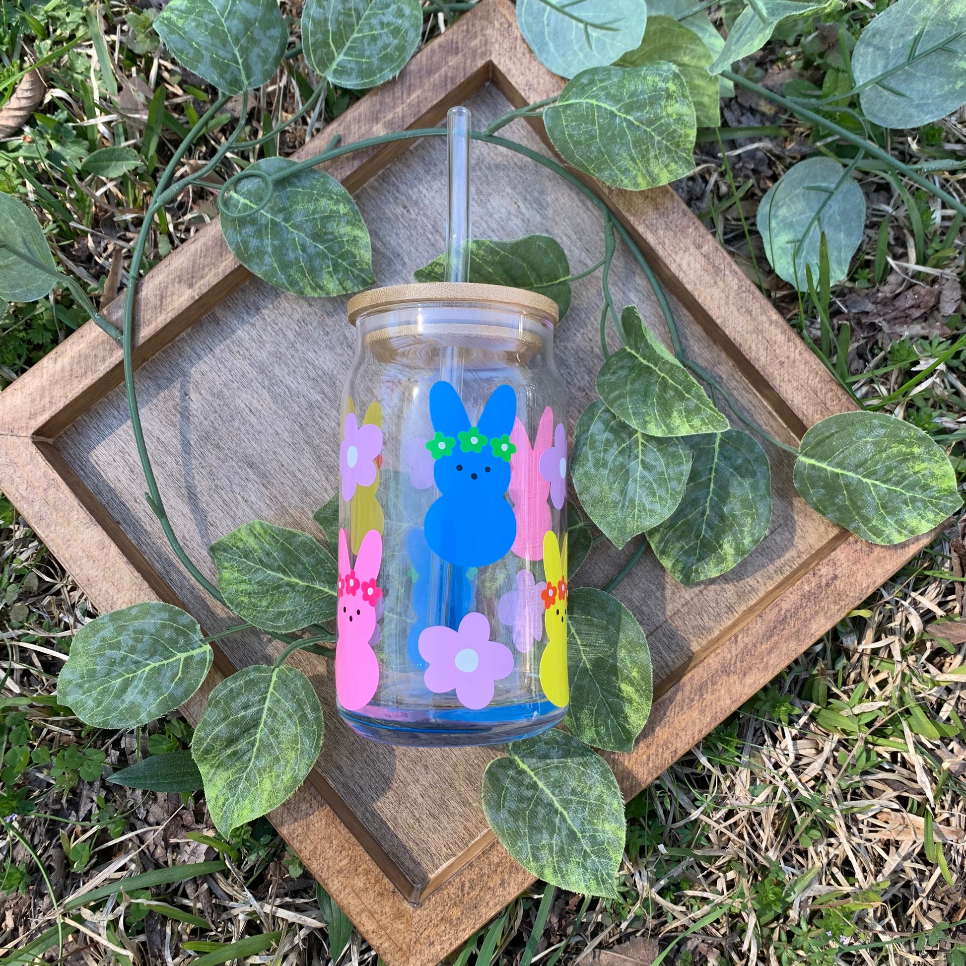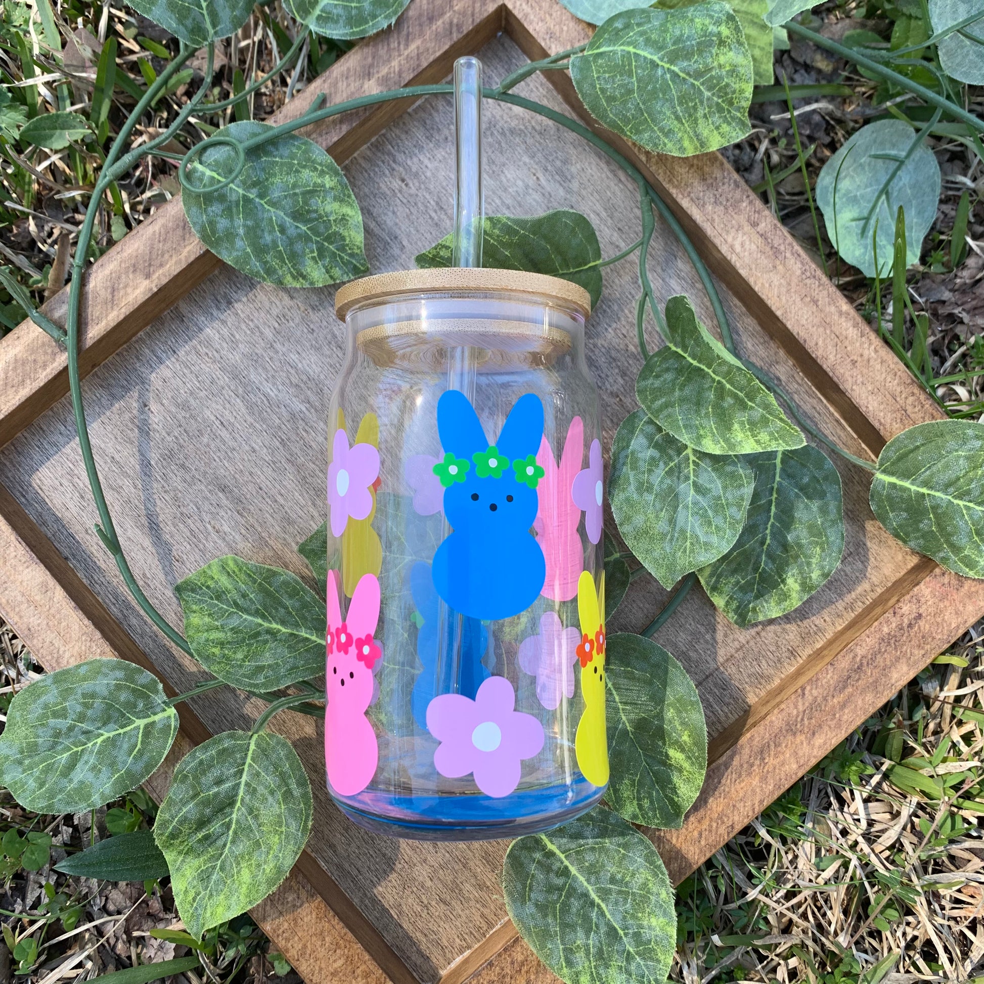 Peeps With Flowers Glass Coffee Cup With Lid & Straw