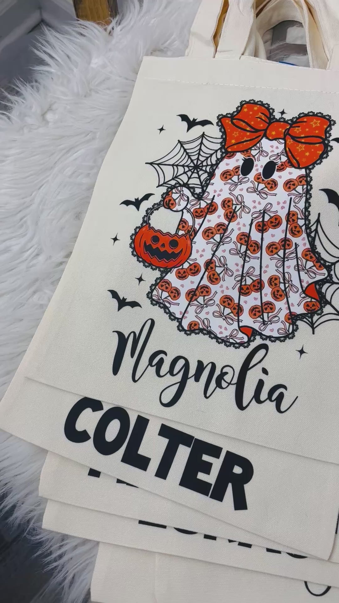 Make Halloween extra special with these personalized trick-or-treat bags! Each bag features a cute ghost dressed in festive Halloween style and can be customized with any name. Made with durable fabric and sturdy handles, they’re perfect for holding candy, treats, and spooky treasures all night long. A fun and unique keepsake your little one will love year after year! 🎃🕸️👻