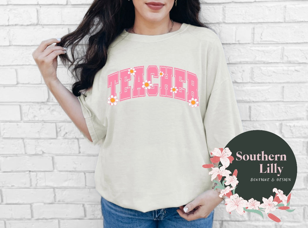 Teacher Pink Daisy Letters Comfort Colors T-Shirt